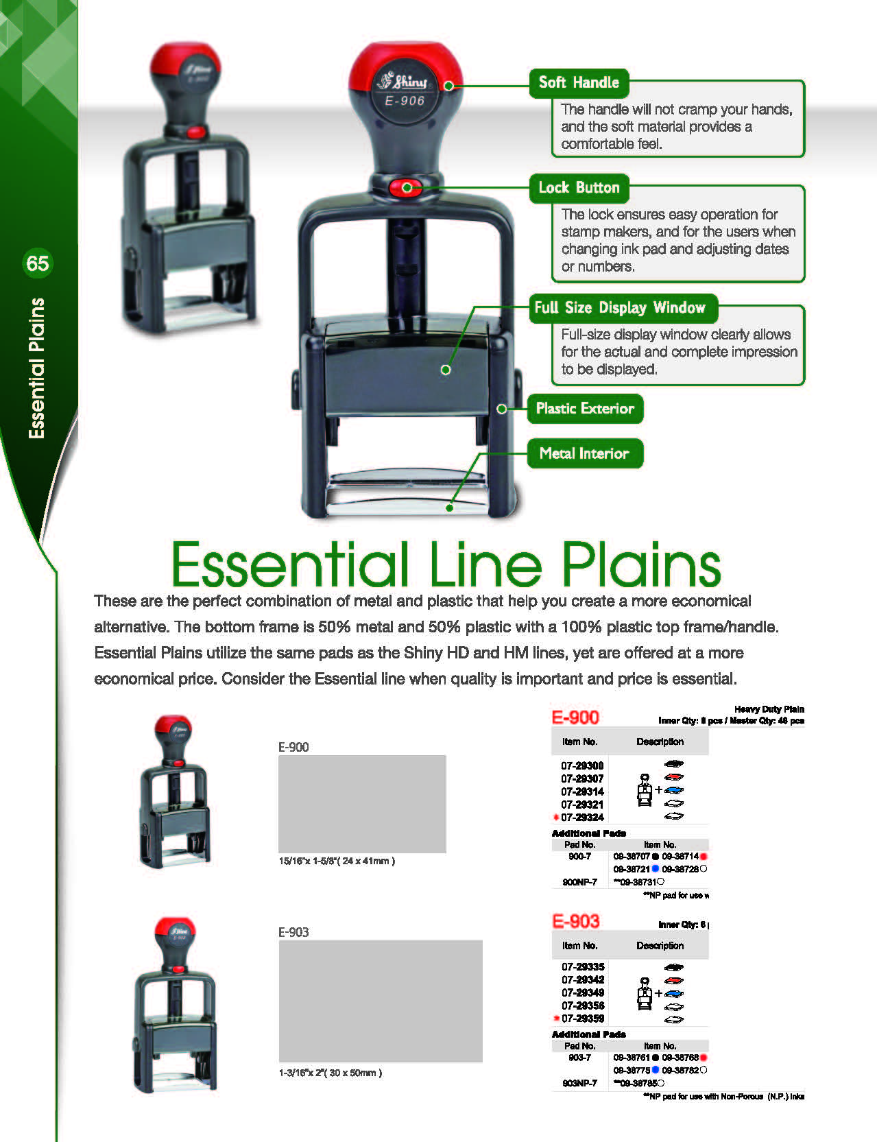 The Essential Line Plains combine the durability of metal and the flexibility of plastic to offer an affordable yet high-quality stamping solution. Featuring a 50% metal and 50% plastic construction, with a 100% plastic top frame/handle, this line delivers the same reliability as the Shiny HD and HM series at a more economical price point. The Essential Plains provide a comfortable soft handle, a lock button for ease of use, and a full-size display window for clear impressions. Perfect for businesses seeking quality, practicality, and cost efficiency.